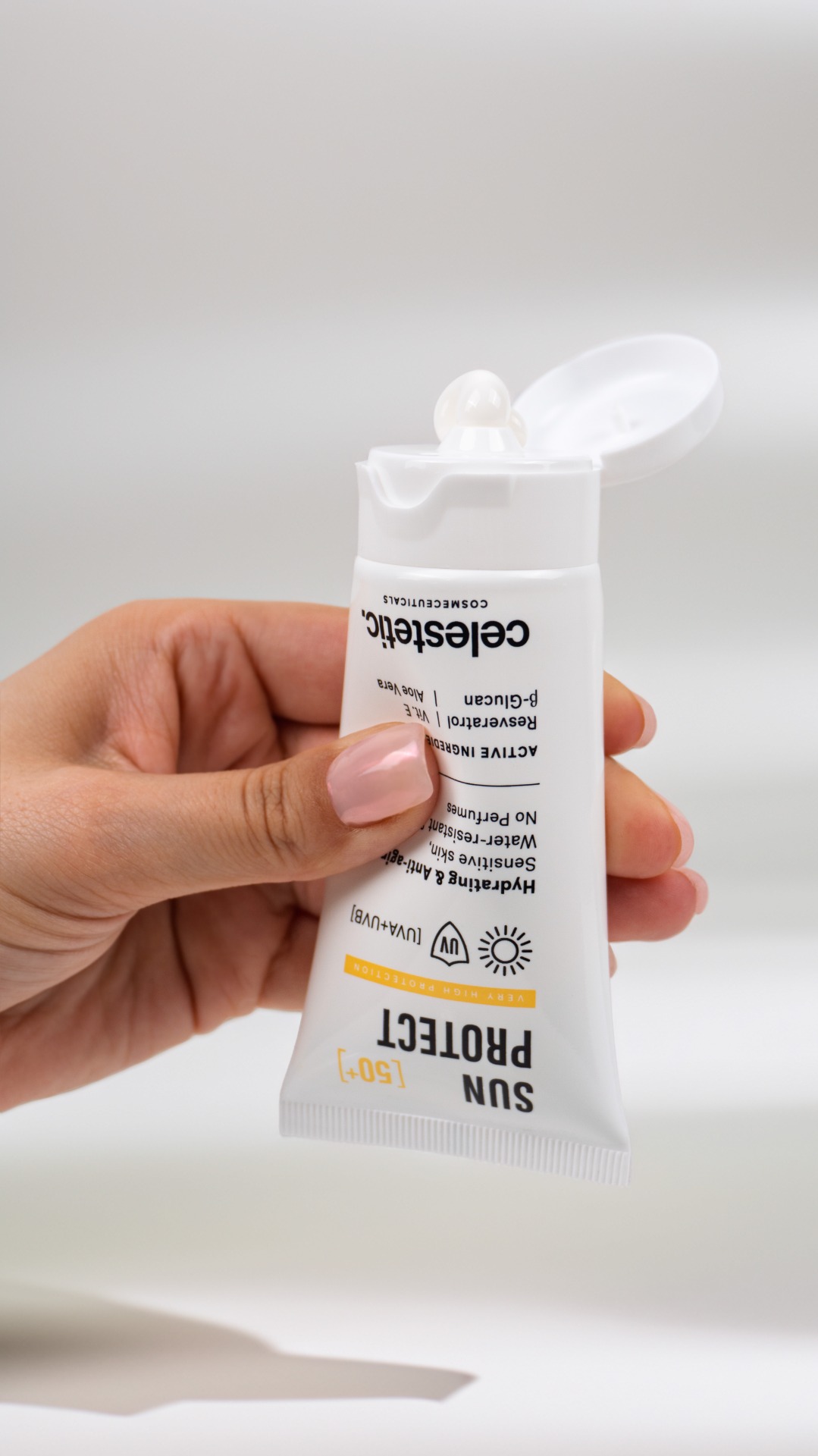 Begin altijd met een schone huid. Gebruik een zachte reiniger van Celestetic om vuil, make-up en overtollig talg te verwijderen. Een schone huid zorgt ervoor dat de zonnebrandcrème beter wordt opgenomen en effectiever kan beschermen.