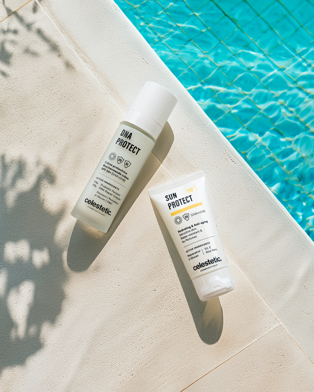 Zonnebescherming van Celestetic beschermt je huid tegen schadelijke UV-straling, die huidveroudering, pigmentvlekken en schade kan veroorzaken. De producten bevatten SPF en antioxidanten, die samen helpen UV-stralen te blokkeren en vrije radicalen te neutraliseren.
