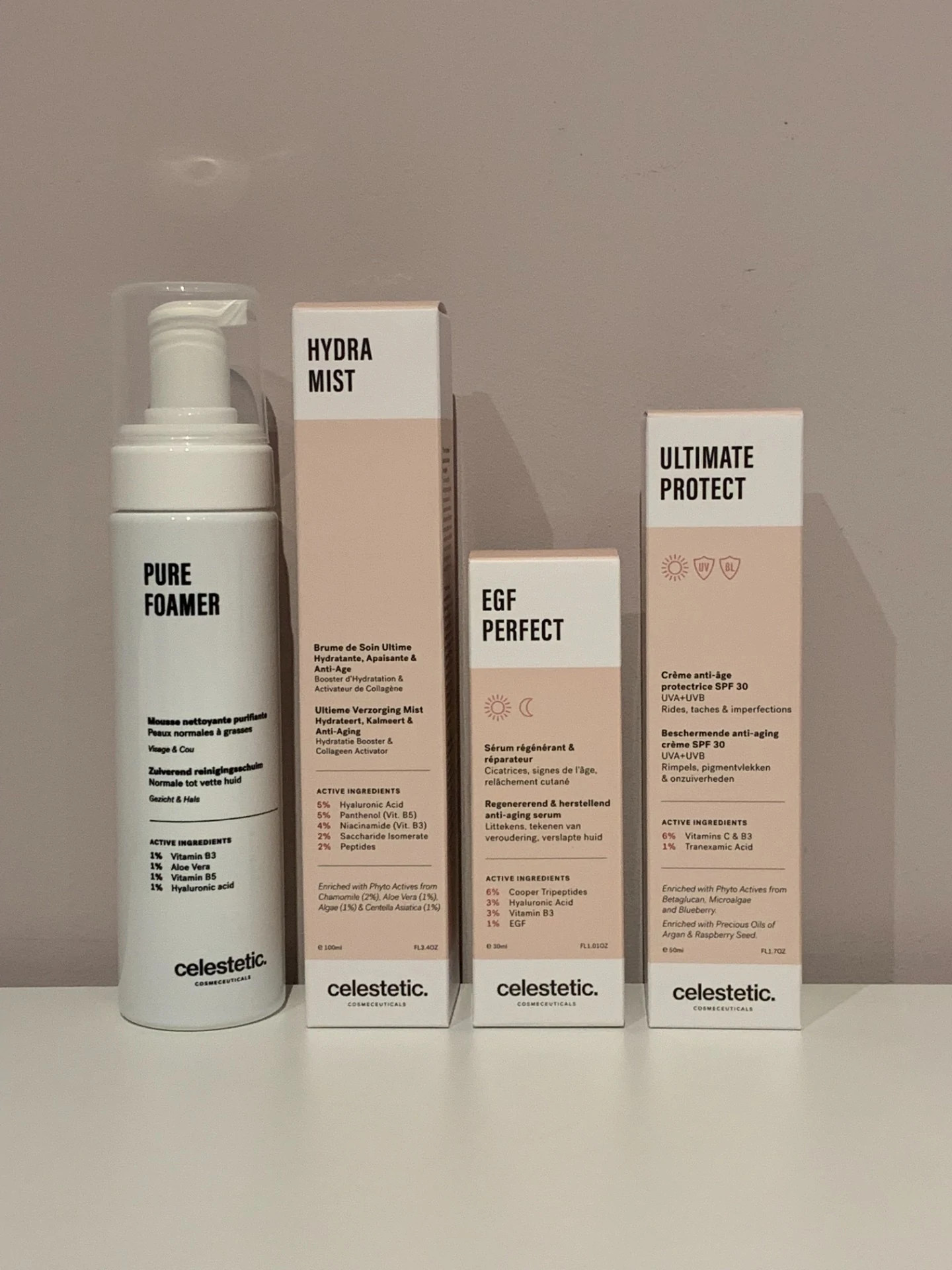 Het Hydra Essential voordeelpakket bundelt vier krachtige producten van Celestetic die samen een complete huidverzorgingsroutine vormen: reinigen, hydrateren, herstellen én beschermen.
