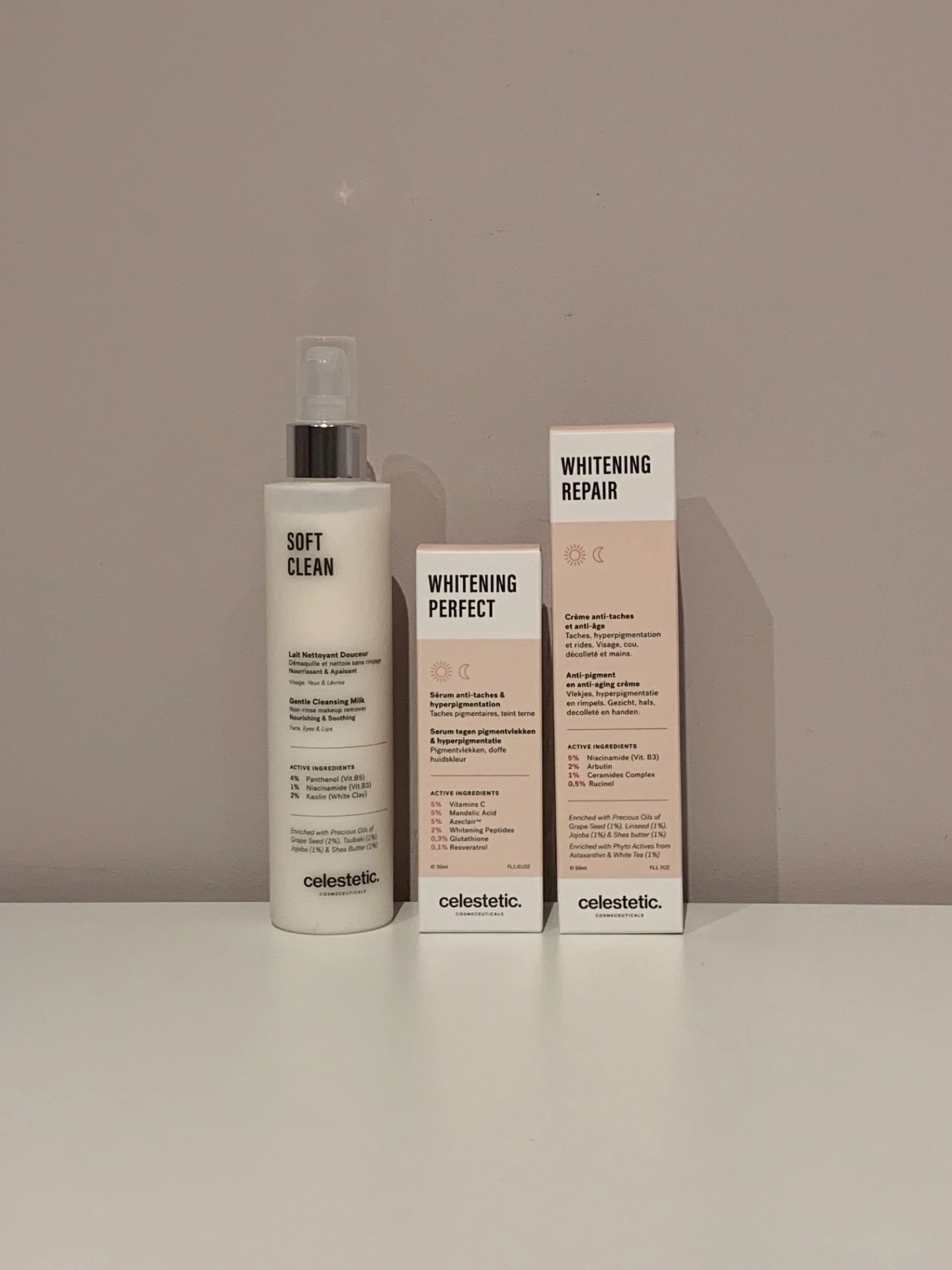 Het Whitening Essential voordeelpakket van Celestetic is zorgvuldig samengesteld om pigmentvlekken en (hyper)pigmentatie aan te pakken en een egale, stralende huid te bevorderen. Het pakket bevat drie complementaire producten die samen een complete huidverzorgingsroutine vormen: